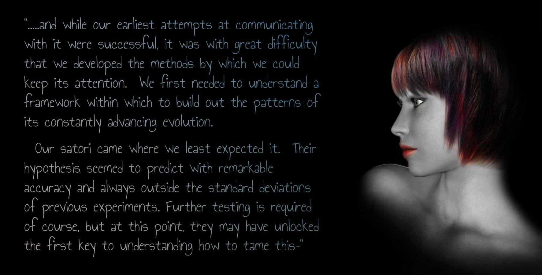 "The responses are nearly instantaneous now, and more reliable than we could have ever expected. The potential for real negotiations may soon be more than the desperate hope of a dying species, but a way to its salvation. Assuming it doesn't escape again...."
